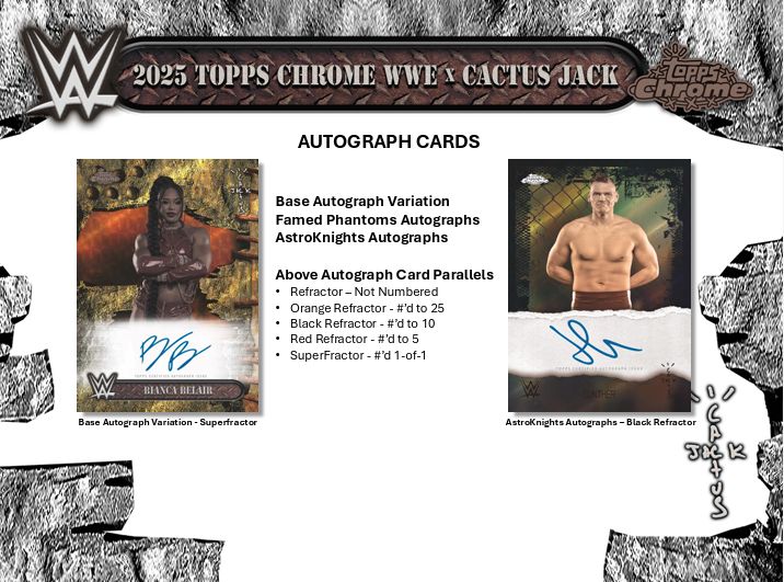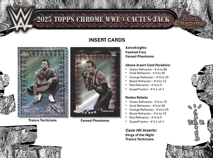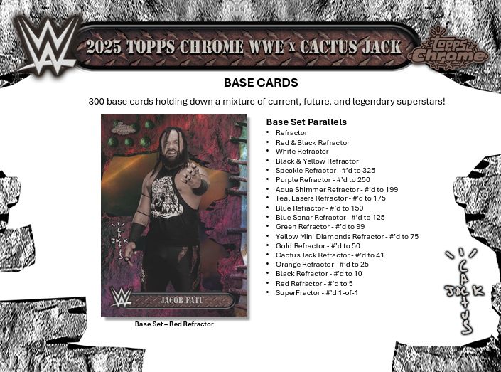 Each pack contains four (4) 2025 Topps Chrome WWE x Cactus Jack Base Cards. Twenty (20) packs per box.